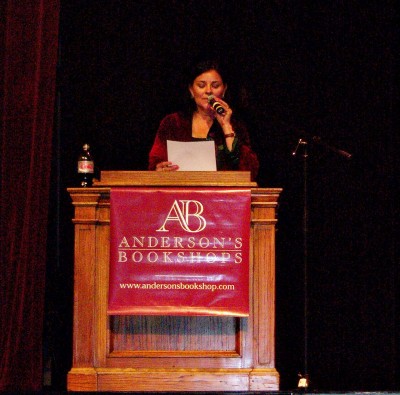 Then she asked for questions from the audience, and there were many of the usual: when will there be a movie (who knows), when is the graphic novel coming out (fall of next year, she thinks), etc. My question focused on whether she ever found herself working events from her own daily life into her novels and if so, could she provide an example? She said it doesn’t happen too often, but a few she could remember involving direct quotes both came from her husband: one about how bad he smelled and the other while teaching a youngster how to pee standing up. It was an entertaining answer.